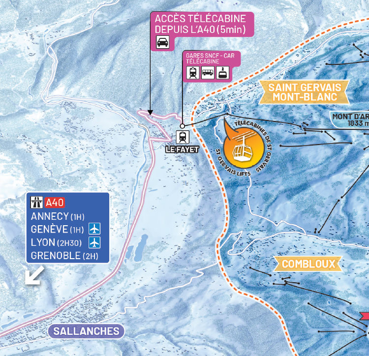 Accédez aux différentes stations : Saint-Gervais Mont-Blanc, Saint-Nicolas, Les Contamines - Hauteluce, Megeve et Combloux - La Giettaz.
